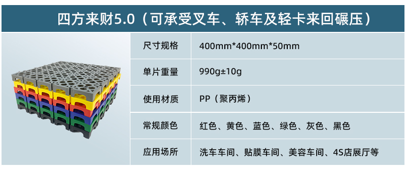 1. 分為3.4.5.厚度,解決不同厚度,統(tǒng)一紋路的問題 2. 啞光平紋設(shè)計,防滑,美觀,易清潔 3. 選用高級原料,加入其他輔料,顏色亮麗,無異味,無污染 4. 顏色為紅黃藍(lán)綠黑灰六色,滿足客戶用色需求,搭配屬于自己的風(fēng)格 5. 通扣鎖扣設(shè)計,容易鋪設(shè)且容易拆卸打理 6. 加強支撐,不容易出現(xiàn)壓壞壓斷現(xiàn)象,滿足大多數(shù)車輛施工的要求 7. 使用年限長,五年超長質(zhì)保,使用無后顧之憂 8. 十字支撐,保證承載最大化的同時,且易排泥排水