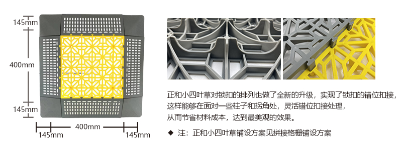 正和小四葉草采用通扣設計,可以確保產(chǎn)品鋪設完成后在任何區(qū)域單獨取出,極大的方便了客戶后期局部清理泥沙等,給店面的日常衛(wèi)生維護提供了很好的基礎。