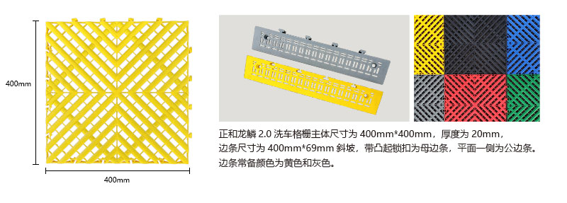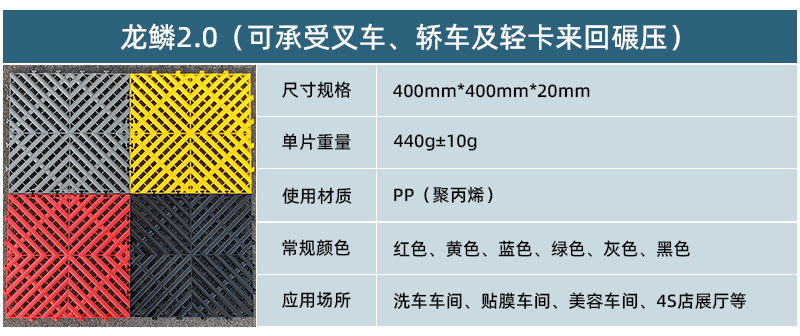 1.龍鱗紋設(shè)計(jì),防滑,美觀,寓意好 2.選用高級(jí)原料,加入其他輔料,顏色亮麗,無異味,無污染 3.顏色為紅黃藍(lán)綠黑灰六色,滿足客戶用色需求,搭配屬于自己的風(fēng)格 4.通扣鎖扣設(shè)計(jì),容易鋪設(shè)且容易拆卸打理 5.加強(qiáng)支撐,不容易出現(xiàn)壓壞壓斷現(xiàn)象,滿足大多數(shù)車輛施工的要求 6.使用年限長,3年超長質(zhì)保,使用無后顧之憂 7.不同厚度,采用不同支撐,保證承載最大化的同時(shí),且易排泥排水