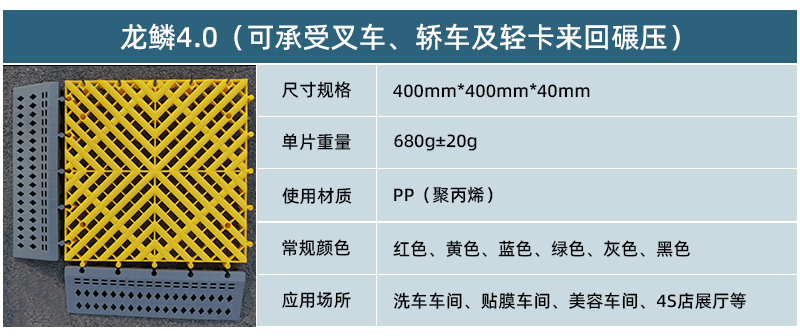 1.龍鱗紋設計,防滑,美觀,寓意好 2.選用高級原料,加入其他輔料,顏色亮麗,無異味,無污染 3.顏色為紅黃藍綠黑灰六色,滿足客戶用色需求,搭配屬于自己的風格 4.通扣鎖扣設計,容易鋪設且容易拆卸打理 5.加強支撐,不容易出現(xiàn)壓壞壓斷現(xiàn)象,滿足大多數車輛施工的要求 6.使用年限長,3年超長質保,使用無后顧之憂 7.不同厚度,采用不同支撐,保證承載最大化的同時,且易排泥排水